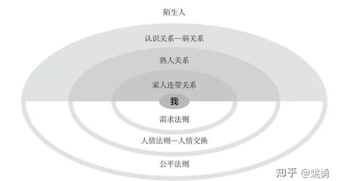 每个人都以自己为中心,向外围绕几个圈层。家人裙带,熟人裙带,弱连带, 完全陌生人。这几个圈层里的法则秩序都是不同。没有统一的契约精神和法制观念。也没有共同的宗教精神纽带连接。每个人都是他人某圈层的裙带关系一员,形成了错综复杂的利益,权力,责任与义务关系。人情也是复杂和暧昧的。